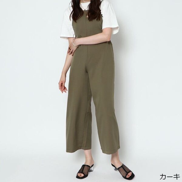 合わせるトップスを選ばないシンプルなオールインワンが登場★肩紐にアジャスターが付いているので、丈感の調節が出来て嬉しい♪タイトめなトップスと合わせるとシルエットにメリハリが出来るのでおすすめ!