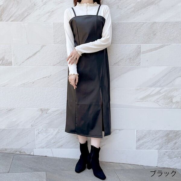 大人っぽく秋らしいキレイめキャミワンピ!合皮スリットワンピースが登場★晩夏から着れる手入れのしやすい合皮素材ワンピ♪ウエスト後ろゴムで自然に引き締めてくれるのでスタイルアップも☆カフェデートなどに今らしいルックスです◎