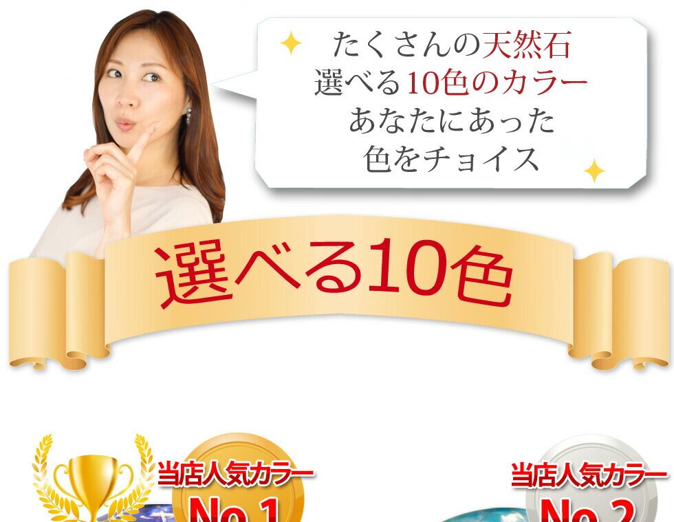 (アメジスト、ヒスイ、トルコ石、ラピスラズリ、タイガーアイ、アクアマリン、ジャスパー、マカライト、黒曜石、ピーチクオーツ、クリスタルなど)※使用されている天然石はそれぞれ違います