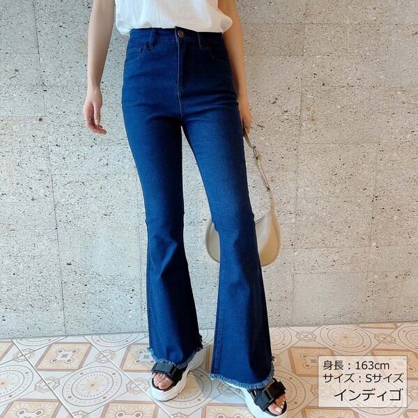 裾にかけて広がるフレアシルエットは足長効果抜群◎裾元のフリンジ加工がオシャレな1枚♪程よくストレッチが効いていて引き締め効果がありスタイルアップが叶います♪どんなスタイルにも合わせやすいデニムはワードローブに活躍間違いなしのアイテム◎