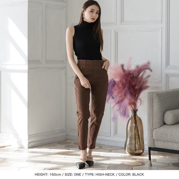 縦ラインを強調するリブニット素材でスタイルアップ効果も期待できます。