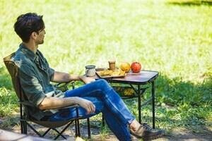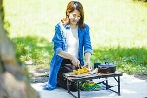 ●屋外に馴染む木目調デザインで、テーブルの高さ調整が可能なフォールディングテーブルです