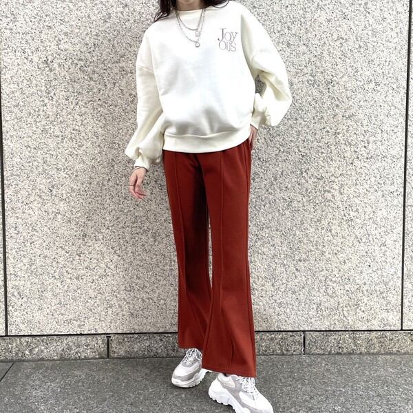 季節を感じる起毛素材と美脚シルエットが印象的なフレアパンツの登場★フロントに切替ラインがあることで縦ラインが強調されスタイルが良く見えて女性らしい印象に☆シーンを問わず表情豊かなスタイリングで着まわせる1枚です◎