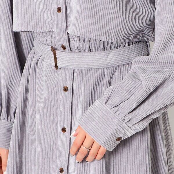 コーデュロイ生地がシーズンムードを高めてくれるコーデュロイワンピースの登場★ウエストをマークし、すっきりとした女性らしいスタイルに♪ワンピースではもちろん、フロントボタンを外して羽織りとしても活躍してくれるデザインです☆