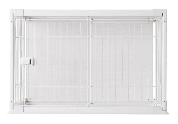 木製の屋根と背面板を付け、ワンちゃんがリラックスできるサークルです