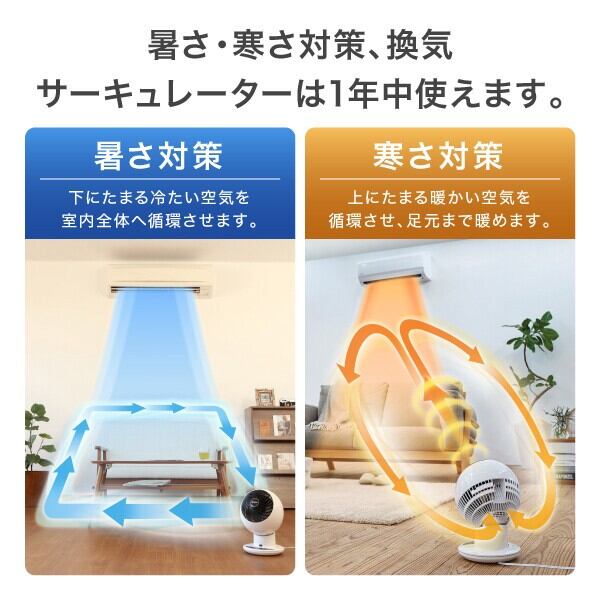 エアコンと併用して夏は冷気を部屋全体へ、冬は暖かい空気を足元へ循環し一年中使えます