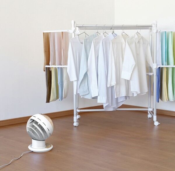 衣類乾燥モードを搭載、中央部では弱い風、端に向かうにつれて強い風になるので、洗濯物が偏らず乾きムラを防ぎます