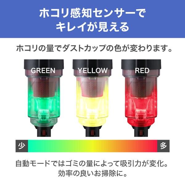 ほこり感知センサーでダストカップの色が緑色、黄色、赤色に変化し、効率よくお掃除ができます