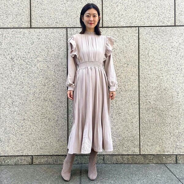 縦ラインのプリーツ加工がスタイルをスラっと細く長く見せてくれる無地フリルシャーリングワンピースが登場★肩のフリルが女性らしいガーリーな雰囲気でかわいい♪無地且つシンプルな色味なのでレースデザインのストールなどと合わせるとより大人ガーリーな印象にUP◎ブーツでもフラットやヒールシューズでも無理せず綺麗めに着れるワンピースです☆