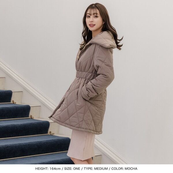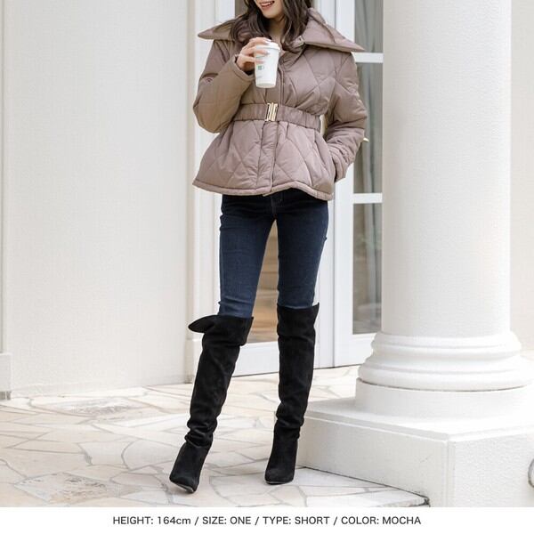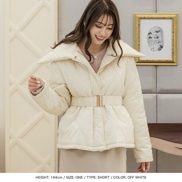 大きめの襟が小顔効果を生み出すキルティングジャケット。ベルトでウエストマークをして、きゅっとしたメリハリのあるシルエットを作ります。ボリュームのある中綿を使用しており、防寒対策もしっかりできるこの冬イチオシアイテムです。身長や好みによって選べるショート丈、ミディアム丈をご用意いたしました。