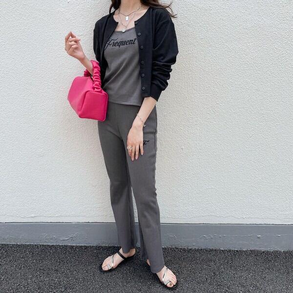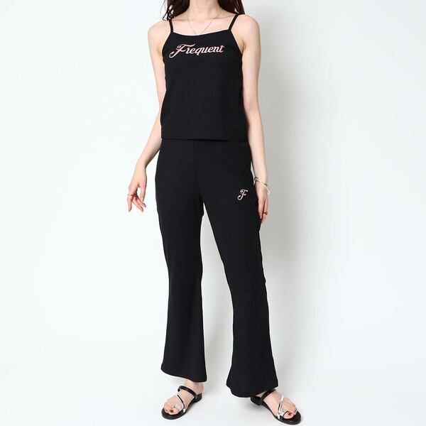 【セットアップ可能】キュートカジュアルなワンポイント刺しゅうがかわいい刺しゅうリブパンツが登場★スラっと脚長効果が期待できるリブ素材♪プチっとワンポイントロゴ刺しゅう☆ルームウェアとしてもOK気分はアメリカ女子◎
