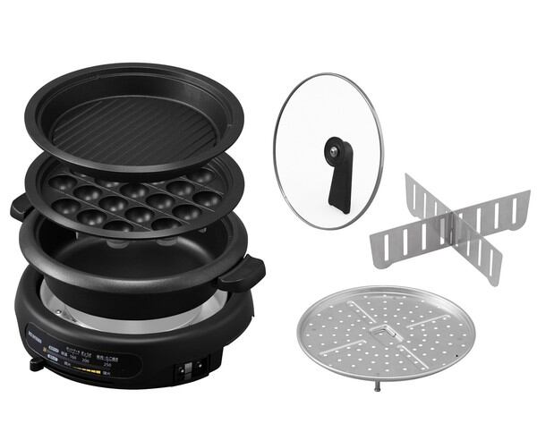 プレートが1枚(深なべ)と2枚(深なべ・溝つきプレート)と3枚(深なべ・溝つきプレート・たこ焼きプレート)付きがあり、2枚・3枚プレートには蒸し板も付いていて蒸し料理もでき、3枚プレートには仕切り板が付いていて深なべを仕切り具材が混ざらないよう分けることができます