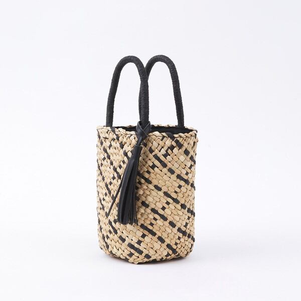 このシリンダーバッグは、シーグラスとアンダリを編み込んで作られたチェック柄が特徴的です