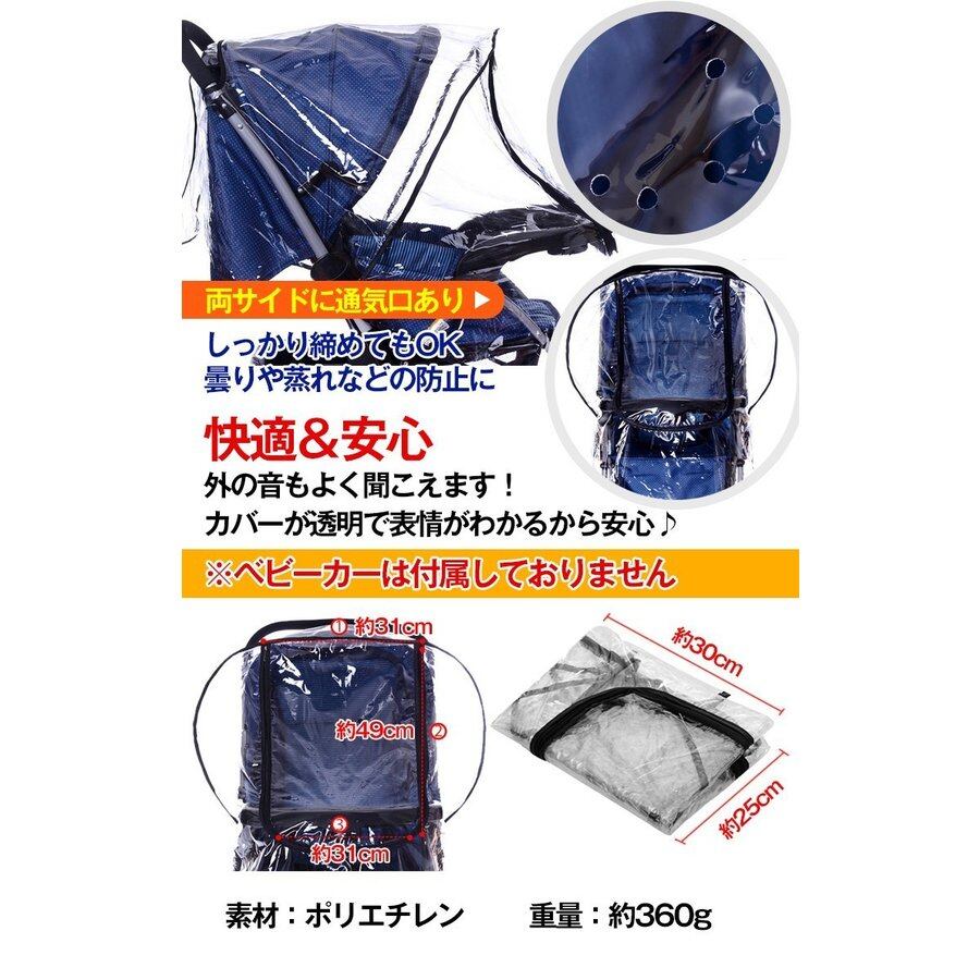 ■ベビーカーに使用するカバーです■市販のベビーカーに対応の汎用タイプです■雨・風・雪・車の排気ガス・ほこりなどからガードします■通気性があるので蒸れにくいです■上下に動くダブルジッパーがついています■ご使用後はコンパクトに収納でき、持ち運びも楽です