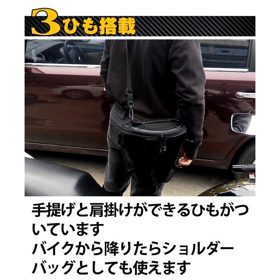 ■バイクに乗る方におすすめなバッグです■グローブやスマホ、財布などの小物が収納できます■バイクのシートカウルにベルトで固定します■手提げと肩掛けができるひもがついています■荷物の必要なツーリングに持っていくのに最適です