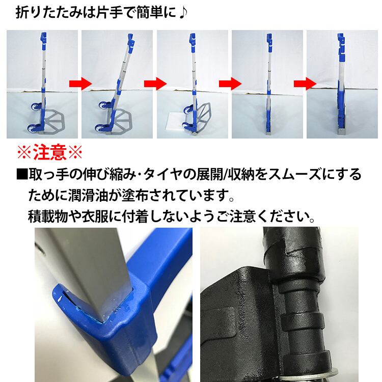 ■重い荷物や持ちにくい荷物を運ぶ時に大活躍■耐荷重は最大約60kg!直径約12cmのタイヤでしっかり支え、段差の移動もスムーズ■滑り止め付きで荷物がズレ落ちるのを防ぎます■重さ約2.9kgと軽量なので持ち運びもらくらく♪■折り畳み式でコンパクトに収まるので収納場所も困りません