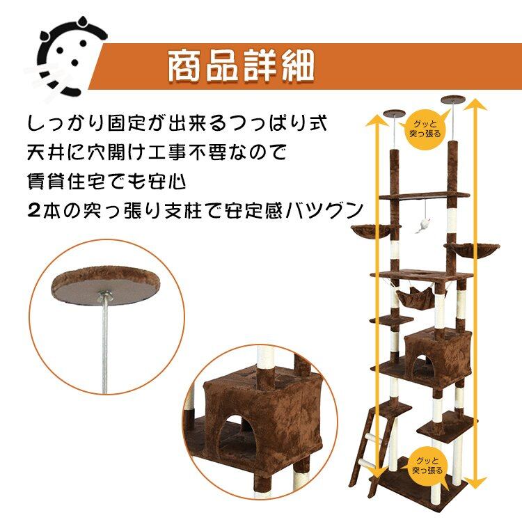 ■猫ちゃんが元気よく遊んでも2本の突っ張り支柱で安定感抜群■高いタワーの上下運動で運動不足解消&ストレス発散に■ねずみのおもちゃ付き■階段付きで子猫やシニア猫ちゃんも上り下りしやすくなっています■柱で爪を研ぐことができます■触り心地バツグンのフワフワ生地で癒しのお昼寝■多頭飼いでも自分のお気に入りスポットの確保ができますキャットタワー キャットツリー スリムタワー 猫タワー 爪研ぎ 突っ張り 多頭飼い アスレチック 麻紐 キャットハウス