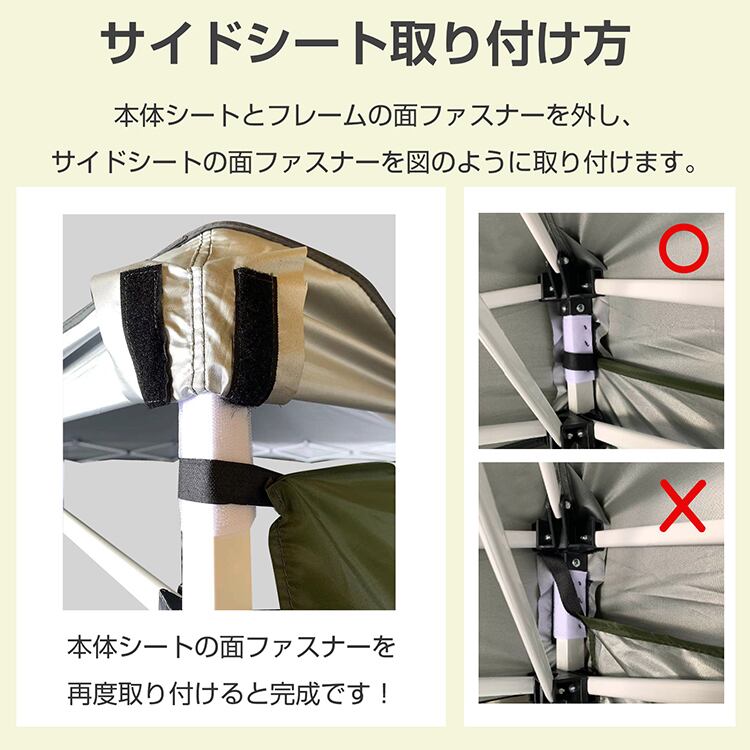 ワンタッチで組み立て出来るタープテント!UVカットなどの様々な機能を搭載サイドシート1枚付属サイドシートの使い方は2面、4面と自由自在サイドシート裾に2箇所コーナーループを設置付属のロープとペグで斜め使用可能