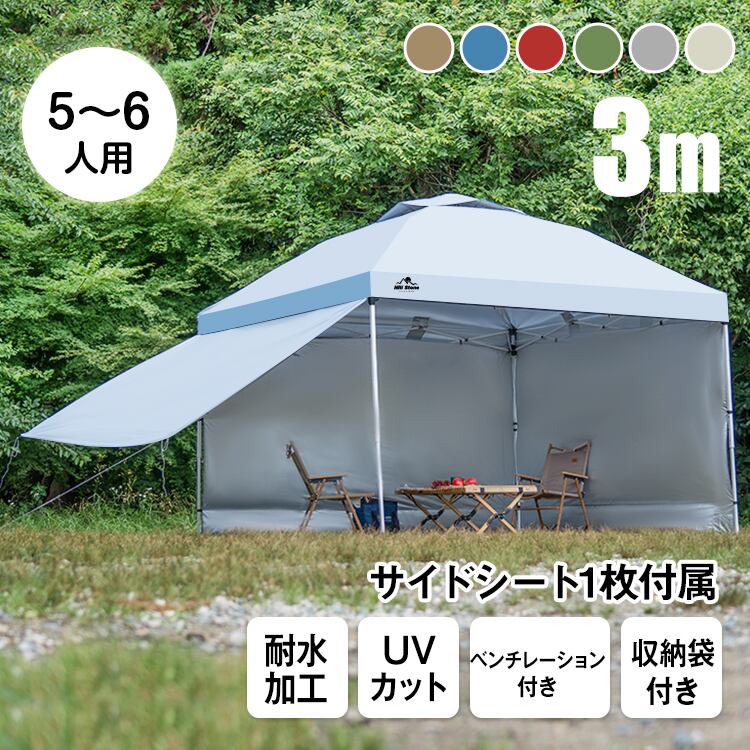 【商品内容】:ワンタッチタープテント/収納ケース/ペグ×8/ロープ3m×4/サイドシート×1【カラー】:ワインレッド/ブルー/グリーン/グレー/ブラウン/ライトグレー【本体サイズ】:(約)3m×3m【サイドシートサイズ】:(約)300cm×175cm【収納時サイズ】:(約)118cm×20cm【重量】:(約)13.5kg