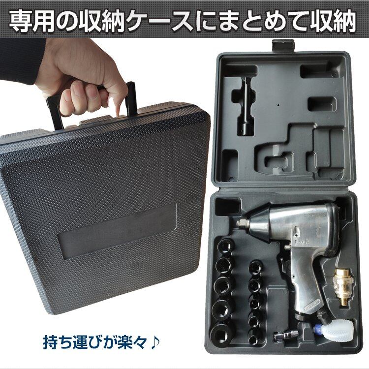 ■自動車のタイヤ交換におすすめなエアーインパクトレンチ■収納ケースを含めた17点セット■トルクは4段階切り替え可能■ワンプッシュで正逆切り替え■国産車の整備で使用されるサイズのソケットとエクステンションバー付属■専用の収納ケースにまとめて収納して持ち運びが楽々