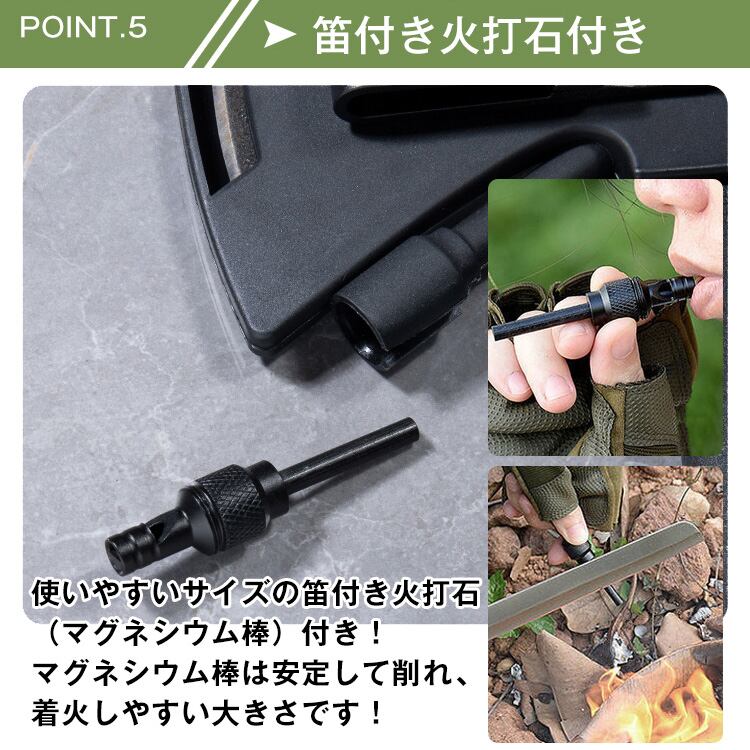 ノコギリは斧のグリップ部分に収納できます!約740gと軽量で使いやすく、頑丈な作りとなっています!刃がグリップに固定されており耐久性抜群です!マグネシウム棒は安定して削れ、着火しやすい大きさです!持ち手付き保護ケースが付いており、持ち運びに便利です!