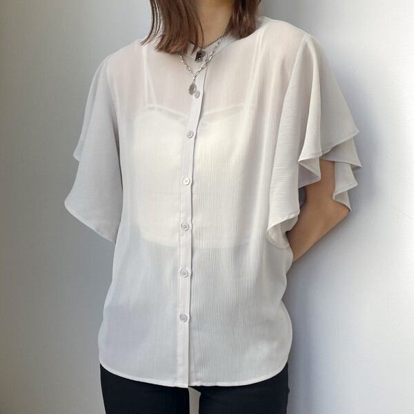 前後2wayでスタイリングできるラッフルブラウスが登場★透け感がありとろみのある柔らかな質感が可愛いらしいアイテム♪動きのあるフレアの袖が女性らしさを演出◎様々なシーンで活躍してくれます!