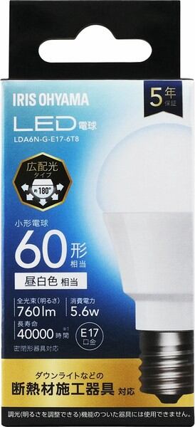 ●光色:電球色相当●定格消費電力:3.8W●格入力電流:0.070A●全光束:約440lm●配光角:約180°●設計寿命:40000h●電源:100V(50/60Hz共用)●使用場所:屋内用●ランプ全体の明るさ:小形電球40形相当●口金サイズ:E17密閉形器具対応/断熱材施行器具対応○/○●エネルギー消費効率:115.7lm/W●光色:昼白色相当●定格消費電力:5.6W●格入力電流:0.098A●全光束:約760lm●配光角:約180°●設計寿命:40000h●電源:100V(50/60Hz共用)●使用場所:屋内用●ランプ全体の明るさ:小形電球60形相当●口金サイズ:E17密閉形器具対応/断熱材施行器具対応○/○●エネルギー消費効率:135.7lm/W