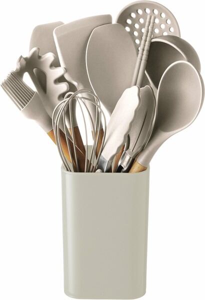 )●セット内容:フライ返し、お玉、穴あきお玉、スプーン浅、ヘラ、菜箸、トング、ツールスタンド■フライ返し○商品サイズ(約):80×325mm○商品重量(約):87g○主要材質:持ち手:天然木、ヘッド:シリコーン○耐熱温度(約):シリコーンヘッド部 200℃■お玉○商品サイズ(約):77×310mm○商品重量(約):93g○主要材質:持ち手:天然木、ヘッド:シリコーン○耐熱温度(約):シリコーンヘッド部 200℃■穴あきお玉○商品サイズ(約):87×310mm○商品重量(約):89g○主要材質:持ち手:天然木、ヘッド:シリコーン○耐熱温度(約):シリコーンヘッド部 200℃■スプーン浅○商品サイズ(約):68×318mm○商品重量(約):79g○主要材質:持ち手:天然木、ヘッド:シリコーン○耐熱温度(約):シリコーンヘッド部 200℃■ヘラ○商品サイズ(約):60×316mm○商品重量(約):103g○主要材質:持ち手:天然木、ヘッド:シリコーン○耐熱温度(約):シリコーンヘッド部 200℃■菜箸○商品サイズ(約):長さ:300mm○商品重量(約):40g○主要材質:シリコーン■トング○商品サイズ(約):開:110×260mm/閉:40×272mm○商品重量(約):113g○主要材質:持ち手:ステンレス鋼、ヘッド:シリコーン○耐熱温度(約):シリコーンヘッド部 200℃■ツールスタンド○商品サイズ(約):95×95×150mm○商品重量(約):130g○主要材質:ポリプロピレン●セット内容:フライ返し、お玉、穴あきお玉、スプーン浅、スプーン深、パスタシャベル、ヘラ、菜箸、トング、泡立て器、ハケ、ツールスタンド■スプーン深○商品サイズ(約):70×318mm○商品重量(約):81g○主要材質:持ち手:天然木、ヘッド:シリコーン○耐熱温度(約):シリコーンヘッド部 200℃■パスタシャベル○商品サイズ(約):65×315mm○商品重量(約):80g○主要材質:持ち手:天然木、ヘッド:シリコーン○耐熱温度(約):シリコーンヘッド部 200℃■泡立て器○商品サイズ(約):65×260mm○商品重量(約):37g○主要材質:持ち手:天然木、ヘッド:シリコーン(心材ステンレス鋼)○耐熱温度(約):シリコーンヘッド部 200℃■ハケ○商品サイズ(約):40×265mm○商品重量(約):62g○主要材質:持ち手:天然木、ヘッド:シリコーン○耐熱温度(約):シリコーンヘッド部 200℃