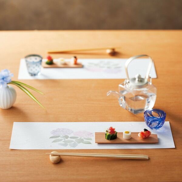 細長の雲竜和紙に季節の絵柄を淡いトーンで配した敷紙です