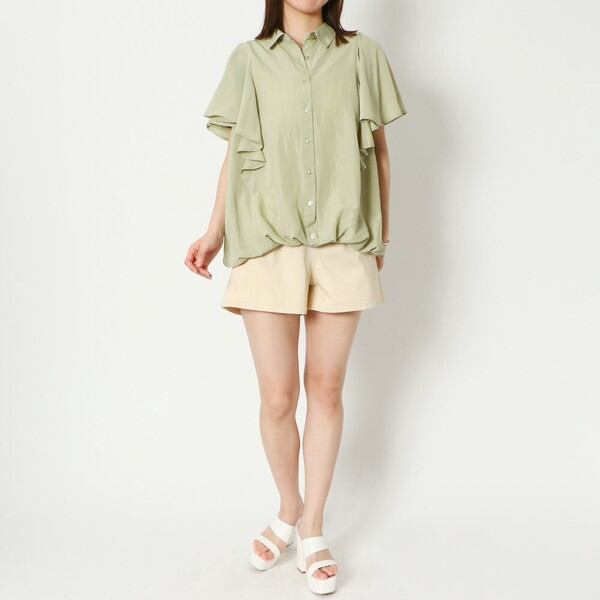 たっぷりのフレアがレディな印象のブラウスが登場★二の腕の華奢見えも叶えてくれるボリューミーな袖がポイント♪フロント裾の斜めタックでふわっと体系カバーも叶う◎いろんなスタイルにコーディネートしやすい丈感とシルエットでシャツとしても羽織としても活躍するアイテムです☆