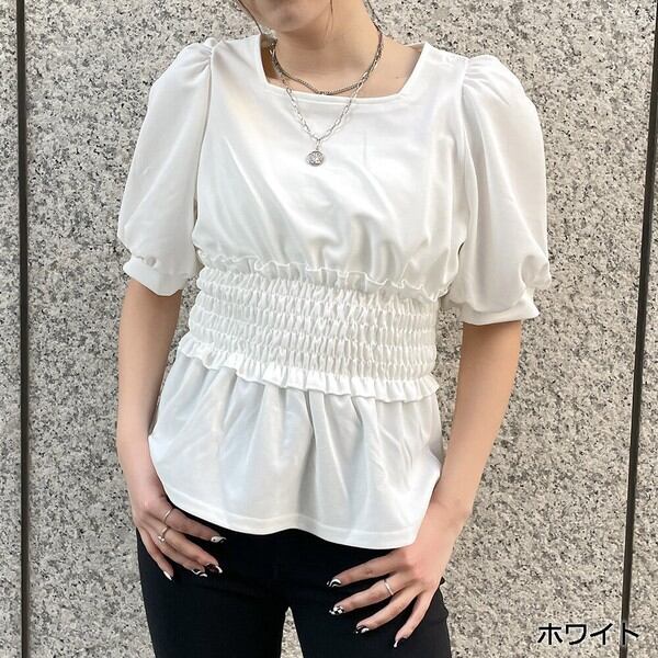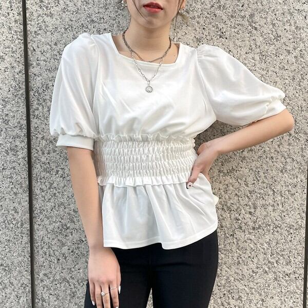 身頃のシャーリングデザインがポイントのスクエアネックブラウスが登場★袖はバルーンスリーブでふんわりとさせて可愛らしい雰囲気♪裾に向かって広がるペプラムラインはコーディネートに華やかさをプラス◎カラーボトムスと合わせたりシンプルにデニムで合わせていただくのがおすすめです☆