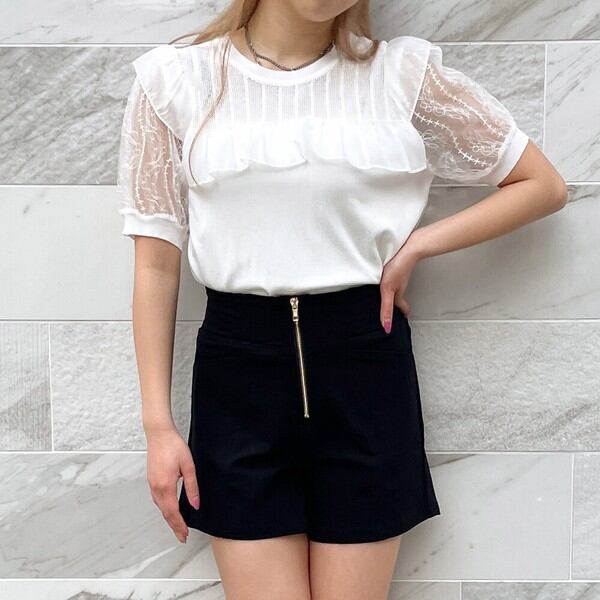 ふわっとした袖のレースにバルーン感が可愛いトップスが登場★ニットにシアー感を出すことで涼やかな印象に♪ワントーンでシンプルに見えながらもフリルやレースで細部にまでこだわったデザイン◎ワイドシルエットやフレアスカートなどボリューム感のあるボトムと合わせるとスタイリング映え間違いなしです☆