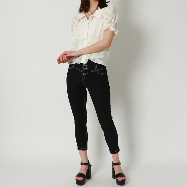 ふんわりと広がるキャンディースリーブが可愛い花柄ジャガードブラウスが登場★透け感のあるシースルー素材に、ジャガードデザインをプラスした表情豊かなアイテム♪さりげなく光るビジューボタンがアクセントに◎スカートに合わせたキレイめコーデにも、デニムを合わせたカジュアルにも合わせられる一着です☆