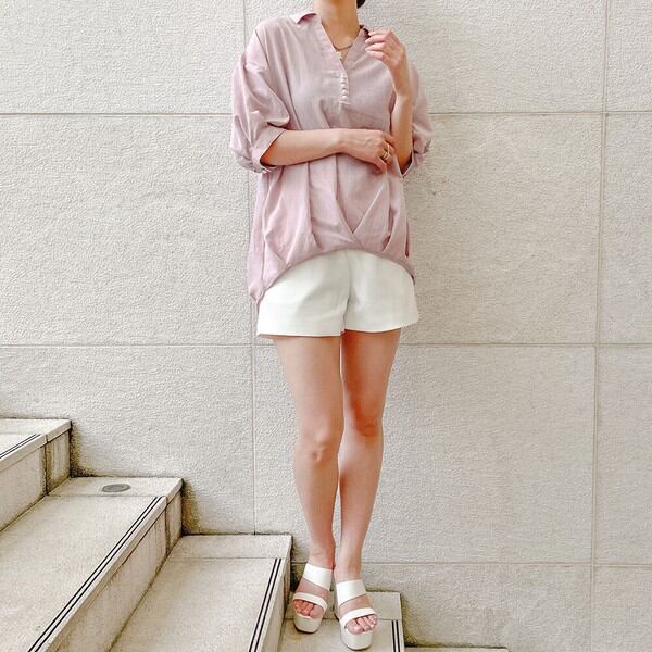 涼やかな素材感と上品なパール使いが魅力なスキッパーブラウスが登場★程良いスキッパーデザインが、ネックラインをすっきりとヘルシーに見せてくれる1着♪フロント部分はインしているようなデザインでこなれ感ある着こなしに◎スカートにウエストインですっきり合わせたり、シンプルなデニムやテーパード、スラックスパンツで合わせてハンサムスタイルも楽しめます☆