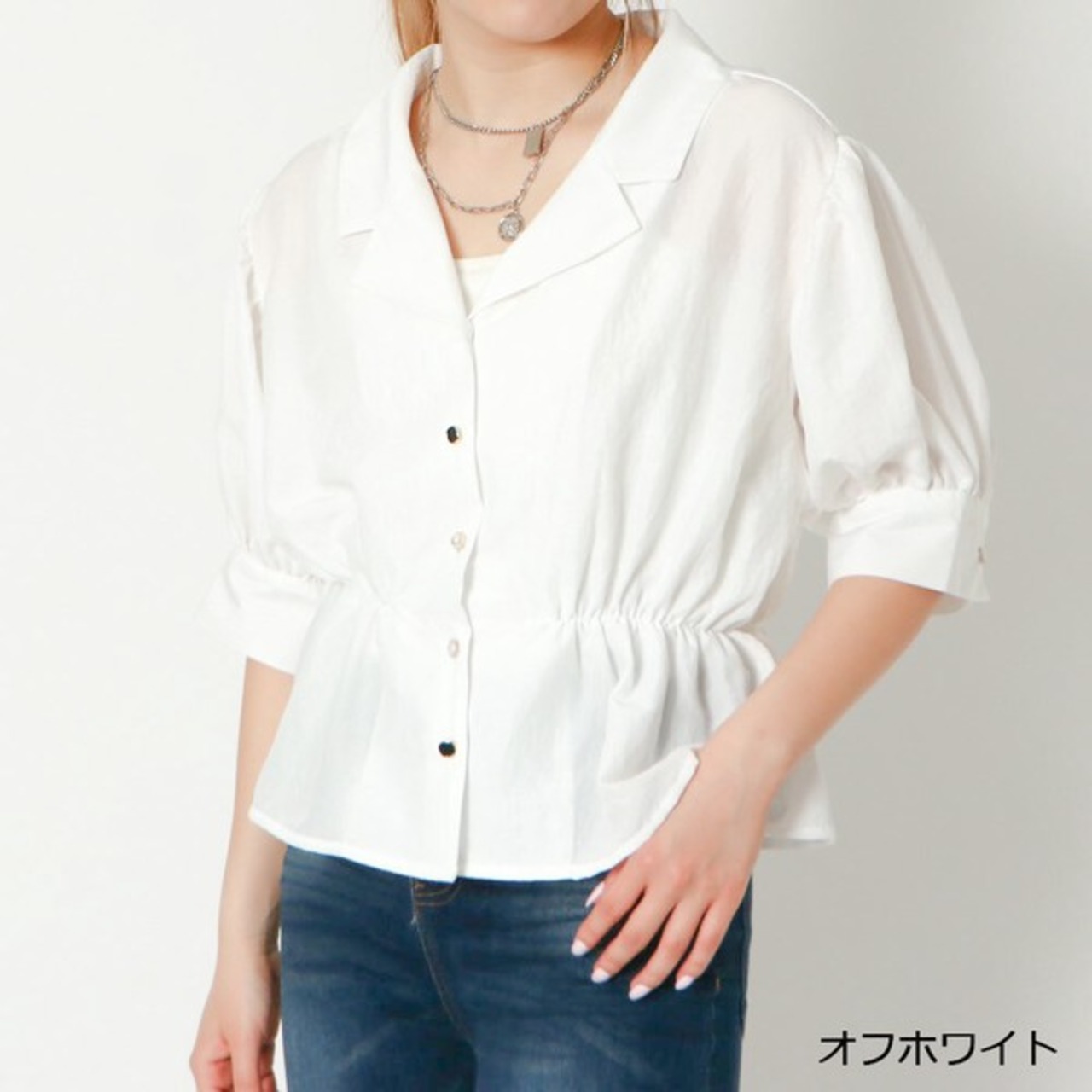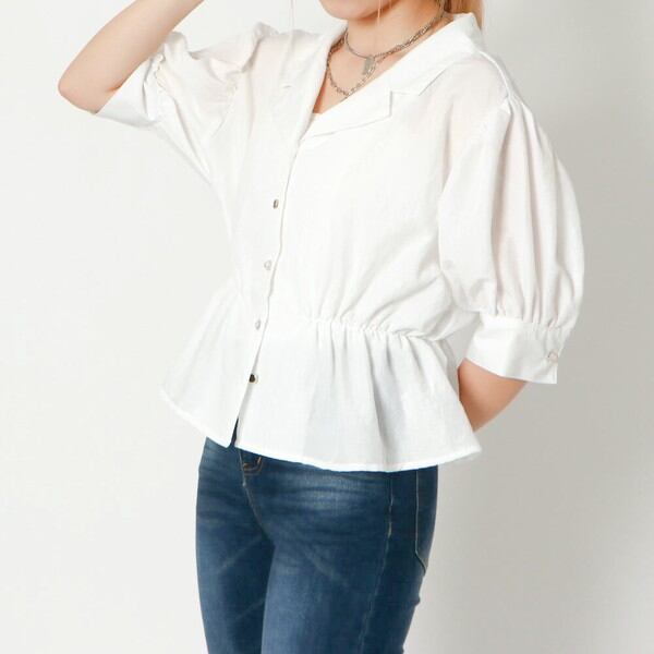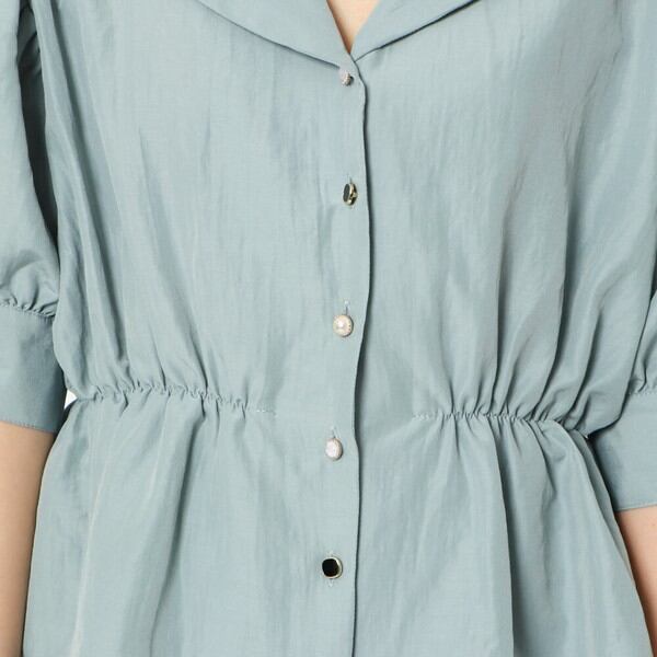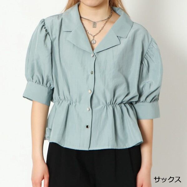 ウエストをゴムで絞った女性らしいシャツブラウスが登場★ハイウエスト仕様でスタイルアップも狙えるトップス♪スタイリングをこなれた印象に仕上げてくれる開襟デザインで抜け感をプラス◎小さいながらも存在感のある多種ボタンで華やかさをプラスしてくれるおしゃれなアイテムです☆