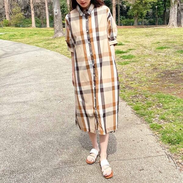 二の腕隠しが上手な袖丈を持つ5分デカチェックシャツワンピースが登場★