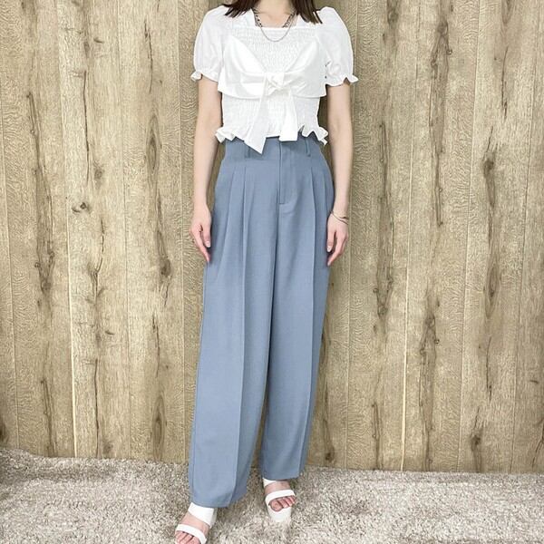 とろみのある生地が女性らしい2タックパンツが登場★2タックでボリュームがありつつも、ハイウエストで腰回りがすっきり見えるのが嬉しいポイント♪センタープレスで脚長効果も◎カジュアルからきれいめまで、使い勝手抜群な美シルエットパンツです☆