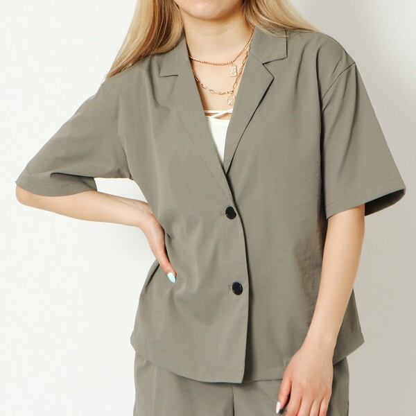 メンズライクな少し長めの半袖が大人っぽい印象のコットンライクジャケットが登場★開襟のデザインで顔周りをすっきりみせてくれる♪セットアップではもちろん、デニムパンツやスキニーパンツなどを合わせるなど単体でもコーディネートが広がる◎ショートパンツ(2323576)とセットアップでもご着用していただけます☆