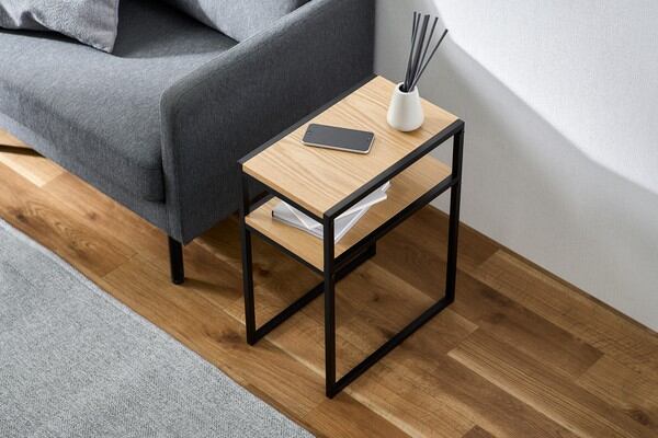 ●天然木とスチールをミックスすることで、お部屋をスッキリとした印象にするサイドテーブルです