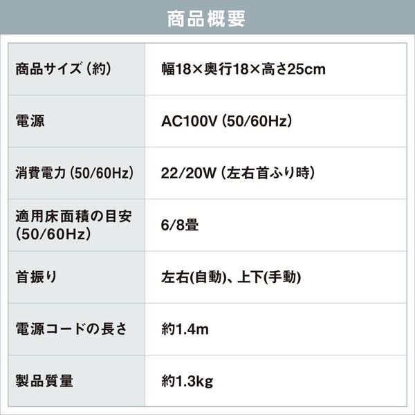 ●定格電圧:AC100V●定格周波数:50/60Hz●定格消費電力(50/60Hz):(固定時)19/17W、(左右首ふり時)22/20W●風力切替:3段階(弱・中・強)●角度調整縦方向(手動):上方向 : 約90°、下方向 : 約25°●適用床面積(目安)(50/60Hz):6畳/8畳●羽根サイズ:12cm●コードの長さ:約1.4m●保証期間:お買い上げ日より1年間------------------以上が表データ--------------------●サーキュレーターは、室内の温度差のある空気を循環させる『空気循環機』です