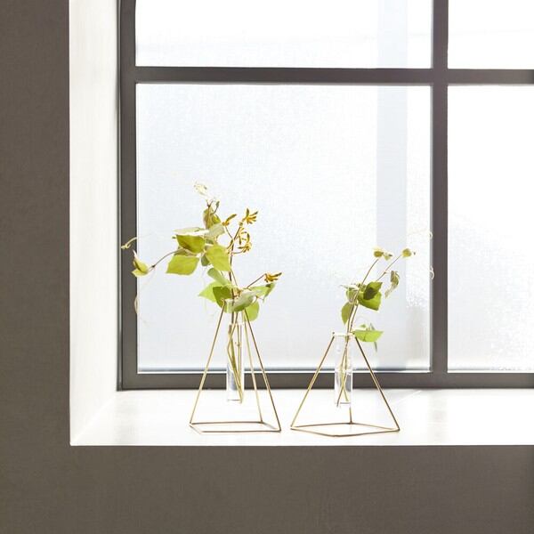 ブラスのスッとした花台と、ガラスのシンプルな試験管が花を素敵に見せてくれるフラワースタンドです