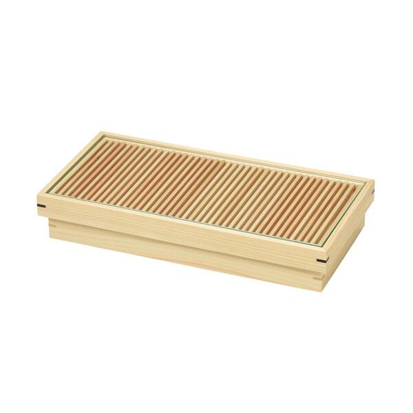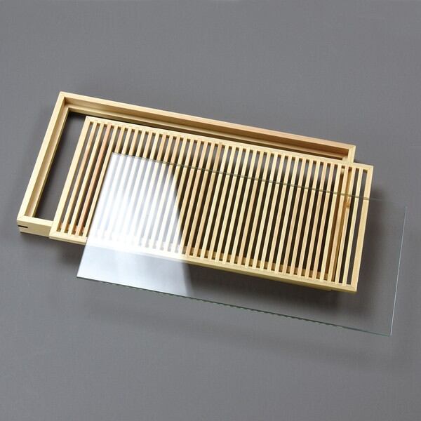 ひのきの繊細な糸格子の上に硝子を敷き、盛付けを演出的に提供できる、凝った盛器