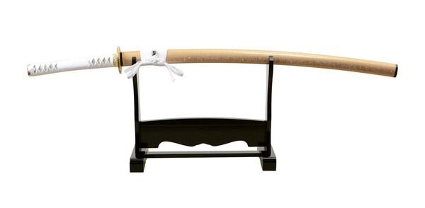 ●素材/刃身・金具:亜鉛合金、鞘:木製、柄糸・下げ緒:人絹、柄本体:樹脂、掛け台:圧縮材