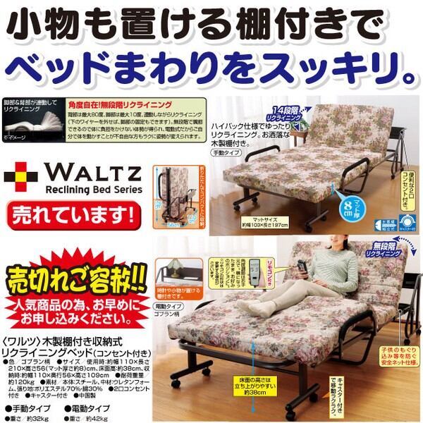木製 棚付き 収納式 リクライニングベッド (手動タイプ 電動タイプ) (ゴブラン柄) / 家具・インテリア 寝具