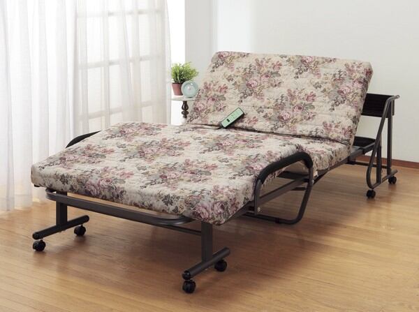 ★木製棚付き収納式リクライニングベット 手動タイプ ゴブラン柄 コンセント付 1点