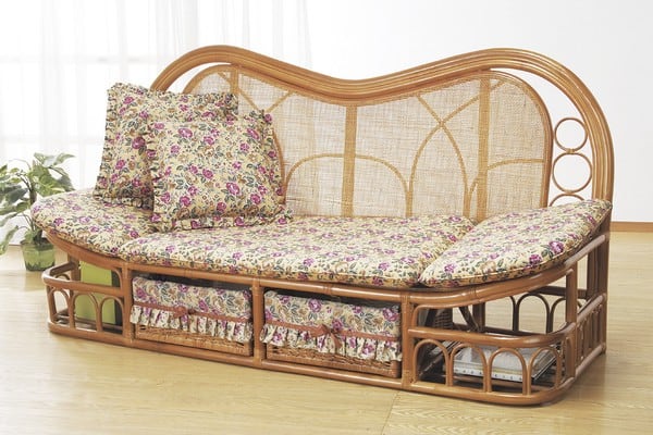 便利な同柄クッション2個付き、天然籐ハイバックカウチソファ