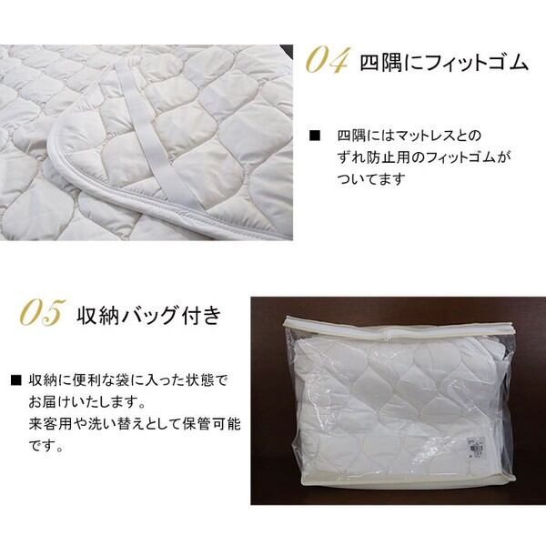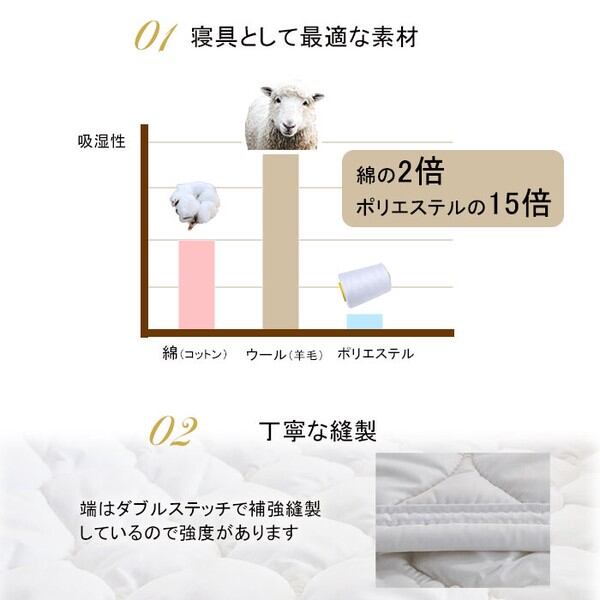 ウールは吸湿性に優れておりへたりにくい特徴がある為、 ベッドパッドに最適です