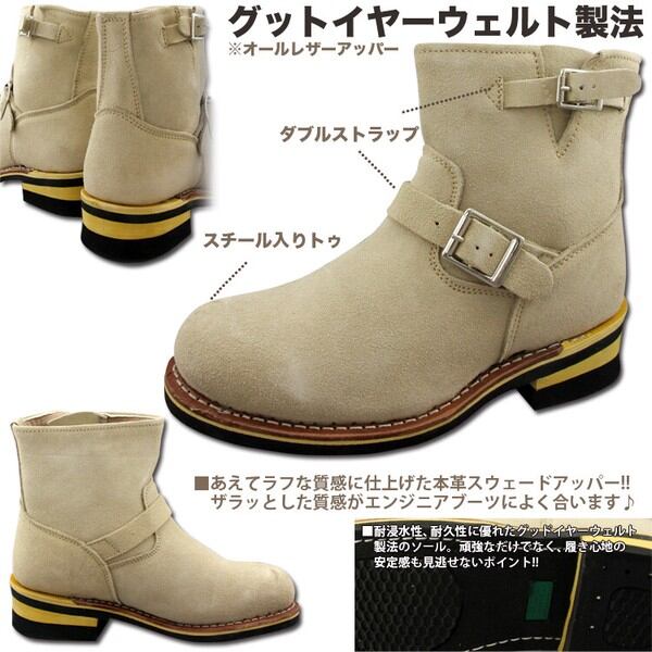 グッドイヤーウェルト製法の本革スエード素材☆ショートエンジニアブーツ!スチール(鉄板)入りトゥで本格エンジニアタウン履きのファッション、ツーリング、安全靴としても活用できます