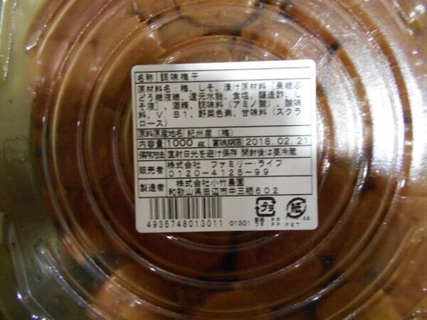 ●原材料:梅、しそ、漬け原材料[果糖ぶどう糖液糖、還元水飴、食塩、醸造酢、しそ液]/酒精、調味料(アミノ酸)、酸味料、V.B、野菜色素、甘味料(スクラロース)