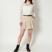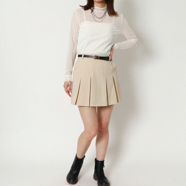 きれいな台形シルエットとプリーツラインですっきりとした美脚を叶えるミニスカートが登場★ベルト付きでメリハリのあるウエスト周りを演出♪バックはウエストゴムでリラックスした穿き心地に◎裏地がパンツタイプなのでショート丈も気軽に楽しめます☆